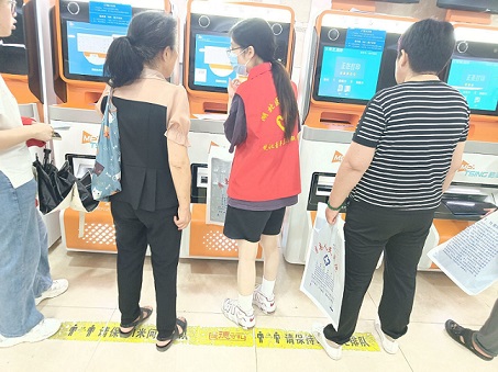圖為實踐隊隊員在房縣人民醫院協助人們使用自助機,幫助人們更方便快捷的掛號繳費取報告。通訊員 胡欣怡 攝