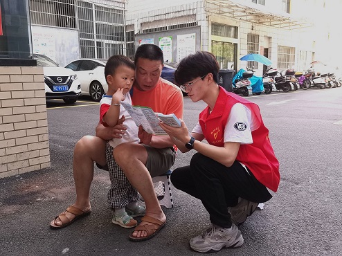 圖為實踐隊隊員在十堰市房縣深入群眾,給群眾分發分級診療科學就醫宣傳手冊,并為其講解相關醫療知識。通訊員 胡欣怡 攝