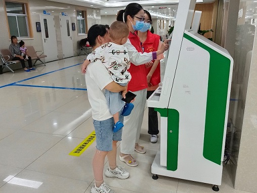 一些患者不了解醫院的器械如何使用,給她們的就醫造成了不便,實踐隊隊員便主動上前幫忙操作機械進行線上掛號。