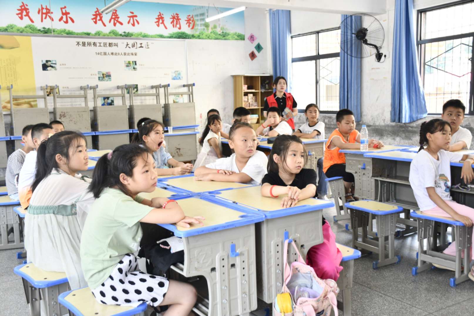 圖為孩子們上課認(rèn)真聽(tīng)實(shí)踐隊(duì)成員講解防拐騙知識(shí)。