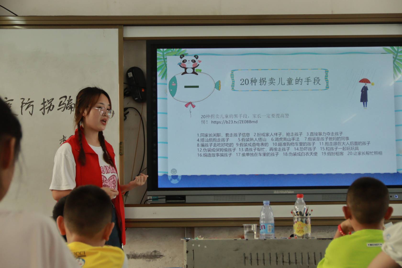 圖為實(shí)踐隊(duì)成員為孩子們講解20種常見(jiàn)的拐騙手段。