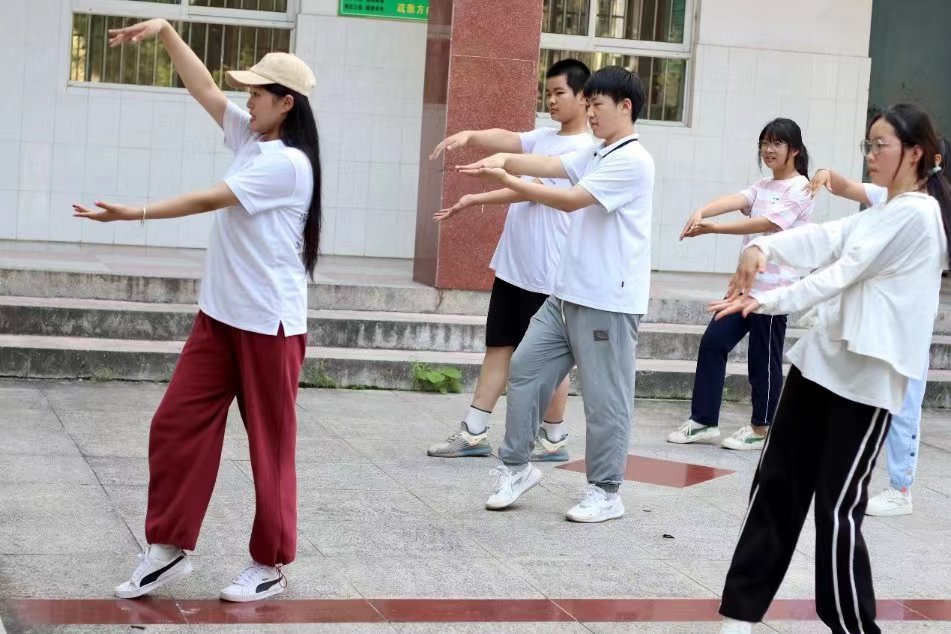 支教第二天,教學組薛雨軒老師早早趕到教室,今天同學們要進行的是物理知識的學習。薛雨軒老師先用科學小故事引導同學們對物理產生興趣,循序漸進的講解生活中的物理現象,然后再轉而學習書本中由前輩們總結出來的物理概念和規律,最后通過例題講解使同學們對力學的理解更加透徹。課堂上,同學們的神情認真而專注,一步一步進入物理科學的世界。下午,在金牛中學高中部的空地上,由張馨月和吳心怡兩位老師帶領,同學們開始了舞蹈基礎動作的學習,抬手、轉頭、屈腿、旋轉……他們對待每一個動作都無比認真,指導老師也耐心地調整著同學們的動作。
