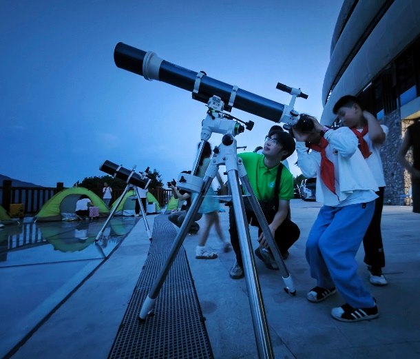 當天晚上,暑期社會實踐團隊來到長虹鄉(xiāng)高田坑村開展活動。帶領當?shù)匦W生共同參觀星空文化館,學習天文知識,通過天文望遠鏡觀察星空、感受“星空藍”的獨特魅力。