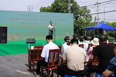 在儀式上,張愛軍書記首先對到場的各位來賓表示熱烈歡迎,并從自然環境、經濟狀況、人口結構、農業發展等方面對蘇陳鎮雙岸社區進行了介紹,并就雙岸社區與南京師范大學泰州學院共建教育實踐基地表達了合作期望。隨后宣布蘇陳鎮雙岸村播節啟動儀式正式開始。