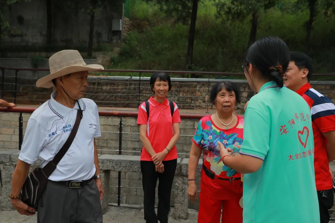 隊員們在分水閘前遇到了來自廣東佛山的游客們,他們自駕來到河南林州,這個平均年齡已經超越65歲的團隊熱情地向隊員們介紹了他們參觀后的感受,他們都被這項偉大的工程所震撼,交流的最后,叔叔阿姨們教給了隊員們“紅旗渠,偉大的工程”粵語的說法。
