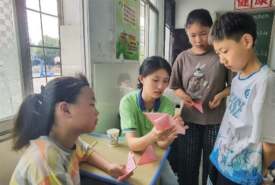 圖為志愿者老師們在課下耐心的教孩子們感興趣的折紙課程的場景。湖北醫藥學院 詹鑫 供圖