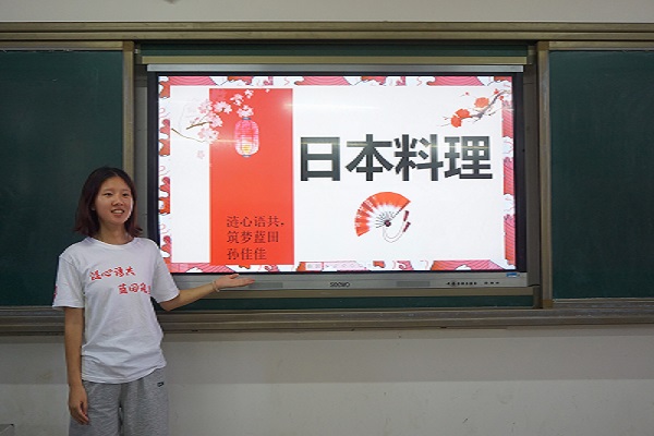 孫佳佳就同學們了解的日本美食進行提問引入課堂,并從日本料理的種類、日本餐桌禮儀兩個方面進一步展現日本的飲食文化。學生們展現出極高的興趣,均大聲搶答,分享自己對于日本飲食的認識。