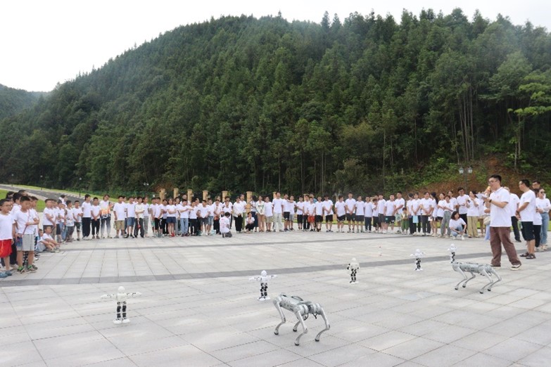 活動伊始,加義學區主任喻理國做開營致辭,強調高校帶動鄉村、科技助力鄉村的重要意義。夏令營營長李澤昊、夏令營成員代表饒伊一上臺發言,表達對此次活動的期待與認同,希望能在此次活動中鍛煉自己,有所收獲。平江縣教育局教育技術中心主任吳再爐和湖南工商大學組織部副部長申立智,指明此次活動的意義,鼓勵同學們積極進取,樹立正確的科學價值追求,勇攀科學技術的高峰。隨后,營員與嘉賓移步至室外,在孩子們的歡呼聲中,無人機與八個機器人進入活動場地,和實踐團成員一起進行科創教育宣傳活動。無人機航模表演團隊通過精確的飛行控制和協同配合,操作航模進行繞行表演,在天空中劃出一條條五彩斑斕的軌跡,隨后無人機拉起橫幅,繪出科創筑夢的美麗藍圖,展現出非常震撼的動態效果。孩子們將機器人圍住,斜歪著充滿求知欲的腦袋,主動上臺與大力、阿爾法及機器狗一起舞蹈。“機器人還會單手做俯臥撐!”實踐團成員說出機器人阿爾法的特殊技能后,會做俯臥撐的孩子與阿爾法同臺競技,現場笑聲和掌聲經久不息,活動氛圍熱烈。