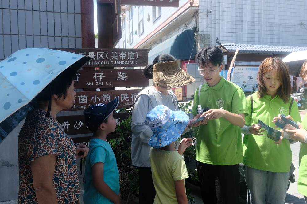 (圖為實踐隊隊員正在向游客解讀宣傳冊 )