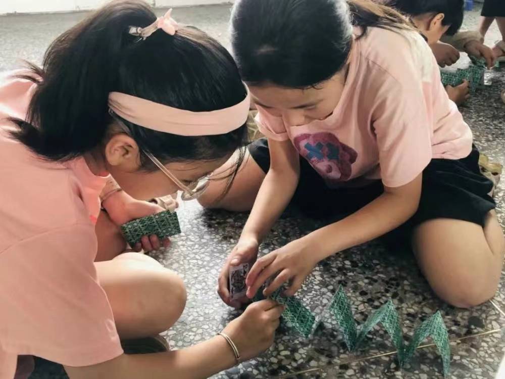 彼此溫暖 并肩成長 為了讓孩子們了解集體團結(jié)的重要性,認識到每個人都要為團體的發(fā)展貢獻智慧,彼此信任、彼此支持,營造真誠、尊重、溫暖的集體氛圍,支教團開展了“合力筑塔”團結(jié)主題游戲。孩子們四人一組,分別使用撲克牌和紙杯疊加搭塔。該游戲?qū)λ脑煨筒蛔鱿拗疲尚〗M自由討論來確定,支教團成員也鼓勵孩子們充分發(fā)揮創(chuàng)造力與想象力。