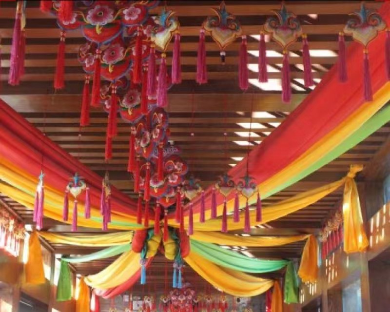 在觀看羌編與羌繡結合作品以及羌族服飾時,我們了解到羌族婦女擅長挑花刺繡。羌繡挑花刺繡多用絲錦線,顯得樸素大方、清爽明快,也有用色線挑花,有的飄帶全是彩色線分條排列,采用納花針法,如五色虹霓,色彩斑斕、絢麗奪目。