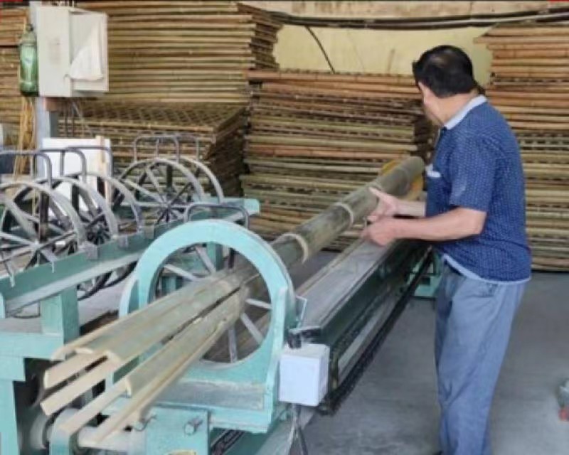 圖為手藝人用破竹機進行竹子初加工,拍攝于培訓學校