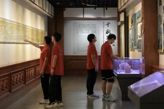 7月3日團隊成員動身至以黃河為主題陳列的自然科技類博物館——黃河博物館,通過觀察館內陳列的從古代到近代治黃的工具,水道圖,筆記,照片和雕塑,以及聆聽講解員所描述的治黃歷史作考察。各成員結合展覽的照片和文字,伴隨著治理黃河故事的講解,幻想出了一幅幅調水治沙的畫面,身臨其境地感受著人民治黃的智慧與艱辛。