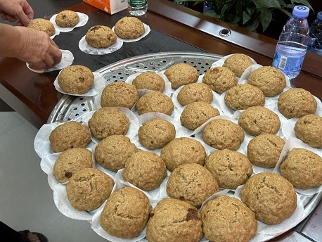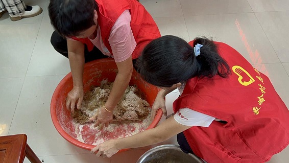 隊員們積極參與,將面團捏成合適的大小,放在鋪滿糯米紙的蒸籠上,體驗到了做麥粄的樂趣,感到無比開心。在等待麥粄蒸好的時間里,隊員們又向村干部請教了有關象嶺村的發展前景問題。村委講述了未來五年的發展計劃與藍圖,讓同學們更好地了解了鄉村振興的重要性。