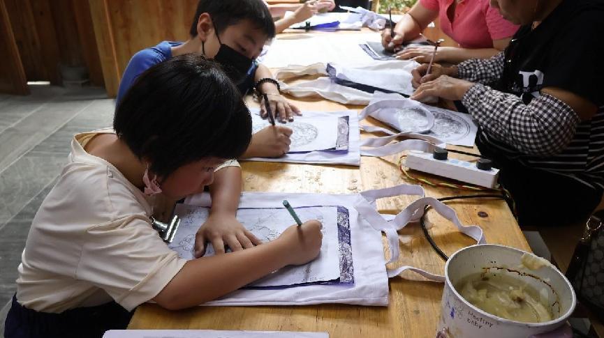 深入展館,團隊成員來到手工扎染體驗坊,不少游客在此體驗手工扎染藝術。隨著社會的變遷,紡織印花的機械化生產得到普及,手工印染業逐步失去生存和發展空間。而這種游客手工體驗扎染的活動,不僅讓扎染在新時代有了新的傳承方式,也是用它的美吸引著人們去制作每一件藝術品。