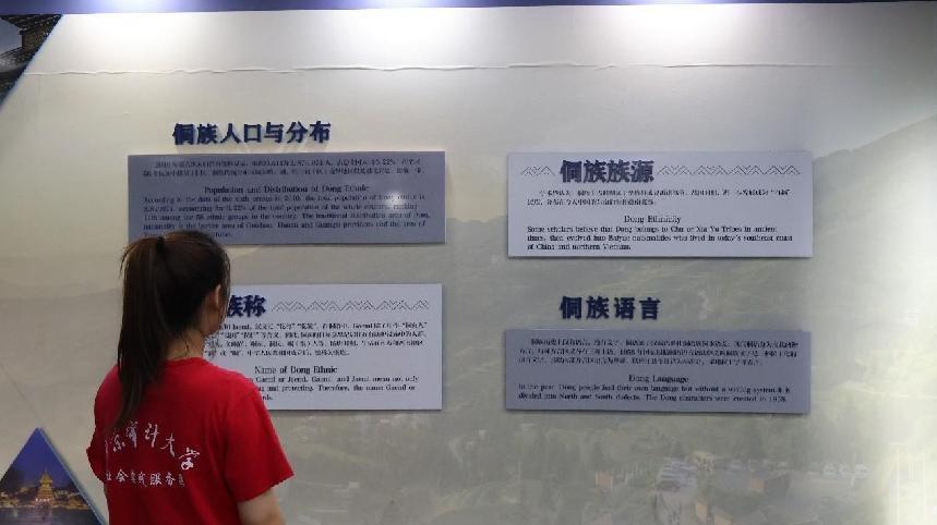 團隊成員們前往肇興·侗族文化展館,深入了解侗族文化。剛到展館主入口,看到扎染的背景和標志性的鼓樓模型,大家不禁驚嘆侗族文化之美,“侗族不僅有美酒、美景,連建筑也是那么的特別。”團隊內的侗族成員自豪地道:“這才只是我們三大法寶之一呢!我們侗族的三大國寶——鼓樓、花橋和大歌,每一樣都很美。”大家在參觀了解侗族的衣食住行后,不由得感嘆中華文化的多彩,民族文化的多樣化。中華文明博大精深、源遠流長,是由各民族優秀文化百川匯流而成。對于這些極具特色的民族藝術品和文化遺產,如何讓其從鮮為人知走向家喻戶曉,在新時代下煥發新活力,是我們需要深入思考的方向。