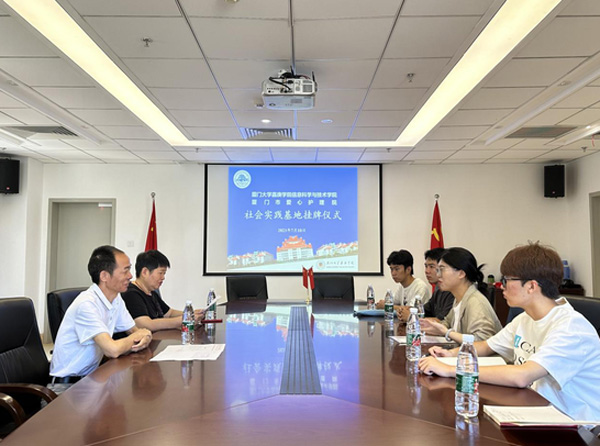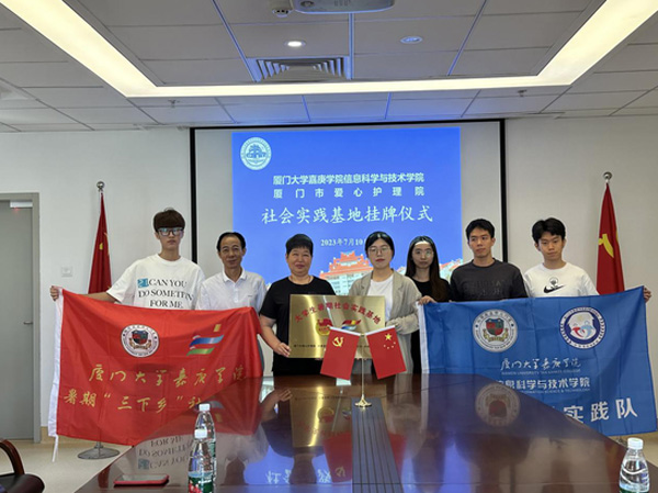 2023年7月10日,廈門大學嘉庚學院信息科學與技術學院同廈門市愛心護理院舉行共建大學生暑期社會實踐基地掛牌儀式暨座談會,并為“大學生暑期社會實踐基地”揭牌。廈門市愛心護理院院長楊美麗、辦公室主任廖洪波以及“數字嘉創”實踐隊指導老師黃冰湟出席了此次掛牌儀式。