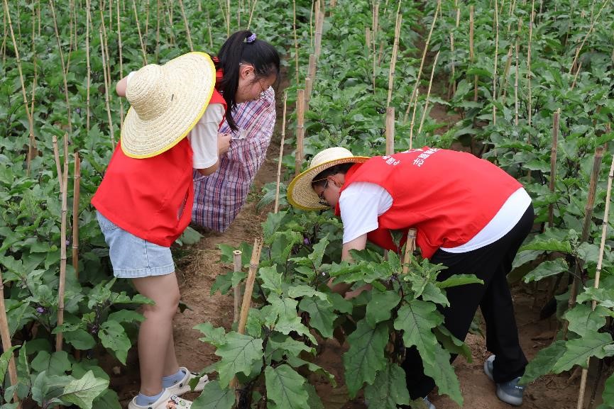 小隊成員兩人一組,進行茄子的采收,沿著種植茄子的田壟,將大小合適的茄子采摘下來,放入袋中。因為準備不足,小隊成員沒有全部換上長褲,在采摘過程中皮膚被茄子的小刺扎地火辣辣的,但是還是比賽著快樂地完成了茄子的采摘。