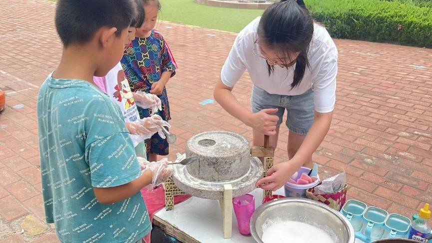 小隊成員首先與小朋友們參與了晨間的室外活動。秉持著“在生活中學習,在實踐中學習”的原則,朱旺村的老師們為孩子們安排了豐富多彩、符合孩子天性同時又具備當地特色的晨間活動。