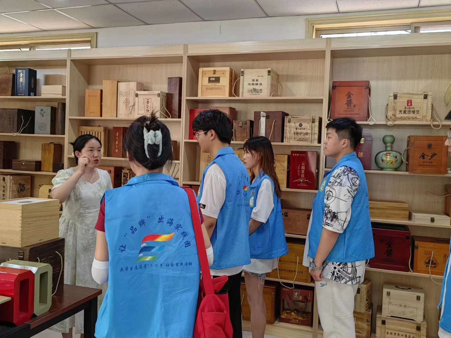 實踐團成員先是在谷瑾瑾總經理的帶領下在百澤木藝品二樓展廳進行參觀,展廳里擺放著各式各樣的酒盒和茶盒,經過與谷總的深度交流,實踐團了解到這些產品的制作采用的是“企業+電商+農戶”的運作模式,公司接到訂單后,先是了解客戶需求,根據客戶需求購買材料,再由農戶拉到家里進行組裝,組裝完成后再拉到廠里進行噴漆、印刷、質檢等工作,這一模式的運用充分帶動了當地居民的就業,為企業帶動鄉村振興賦能。