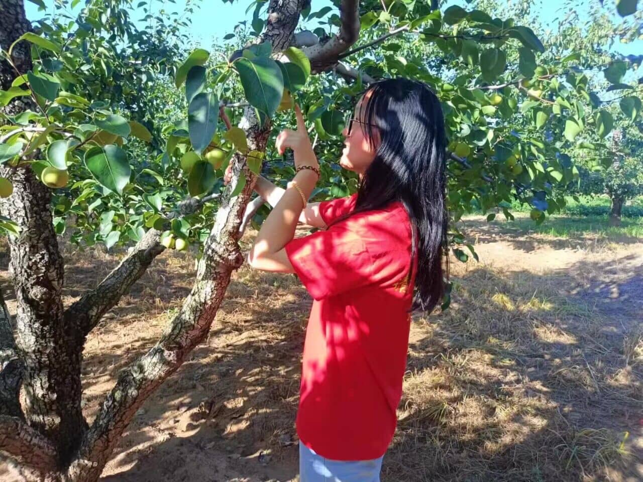 長(zhǎng)風(fēng)一卷,百畝梨樹沙沙作響,梨香四溢。隊(duì)員們仔細(xì)觀察梨樹,尋找到長(zhǎng)得健康、果實(shí)豐盈的梨樹。實(shí)踐隊(duì)員用專業(yè)的工具輕輕地摘下成熟的梨子,避免對(duì)梨樹和梨子造成傷害。隊(duì)員們?cè)诓烧^(guò)程中相互配合,互相幫助,保證采摘的效率和質(zhì)量。在采摘過(guò)程中,實(shí)踐隊(duì)員們還和梨園工作人員進(jìn)行了交流,向他們請(qǐng)教梨樹的種植和管理技巧,了解他們的經(jīng)驗(yàn)和見(jiàn)解。他們積極參與到梨園的生活中,與工作人員一起分享梨子的好處和鄉(xiāng)村的美麗。
