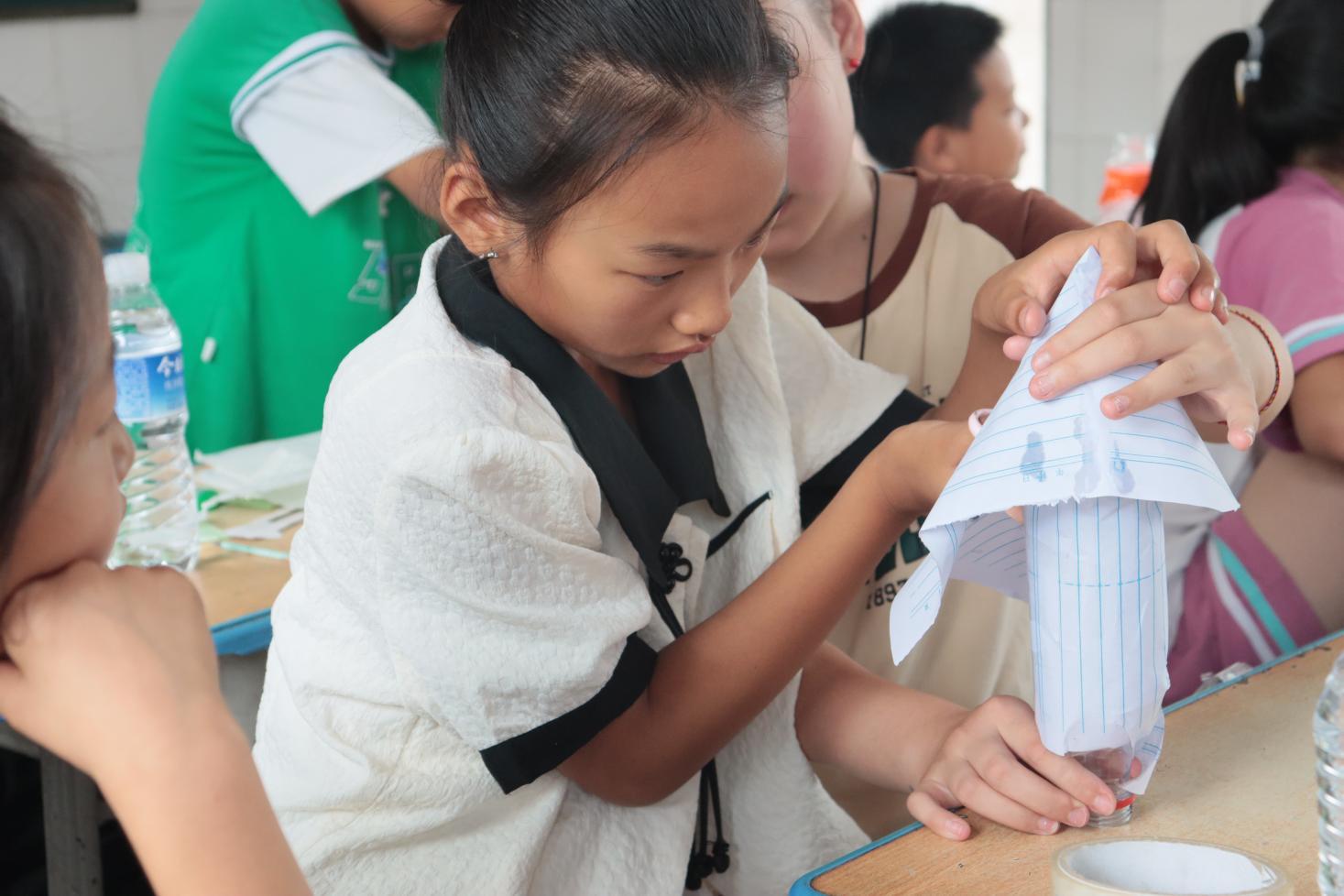圖為三年級同學認真制作水火箭