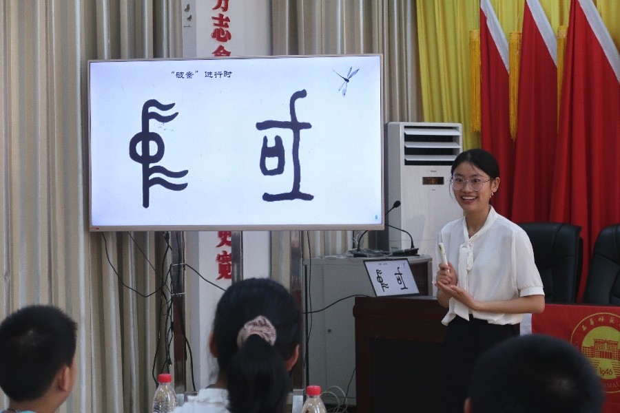 支教是我們此次實踐的主要內容,我最終選擇的授課主題是甲骨文識漢字。曾經我覺得甲骨文離我很遙遠,直到大學我才系統地接觸到它。我印象特別深刻,老師借助甲骨文字形,從能直立、彎腰勞動、謙恭作揖,分析了人之為人的意義。當時我在想,短短兩筆,已是極省,卻能承載這樣深厚的含義。我們的祖先對于萬物的細致觀察,對人和動物區別的獨特認知,給予我一次心靈的激蕩。今天,我希望能夠通過支教把最初的那份心動傳遞下去,以想象為羽,負載孩子們來一場跨越時空之旅。