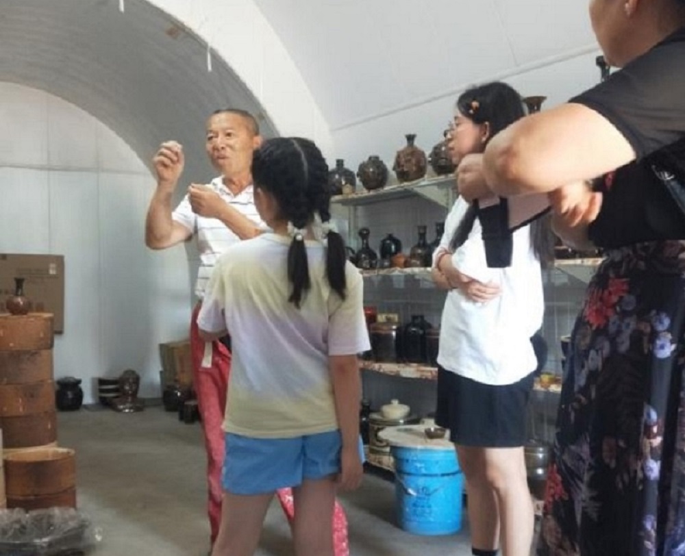 陶藝傳承人周新平為實(shí)踐隊(duì)員和游客講解堯頭窯燒制陶瓷的歷史