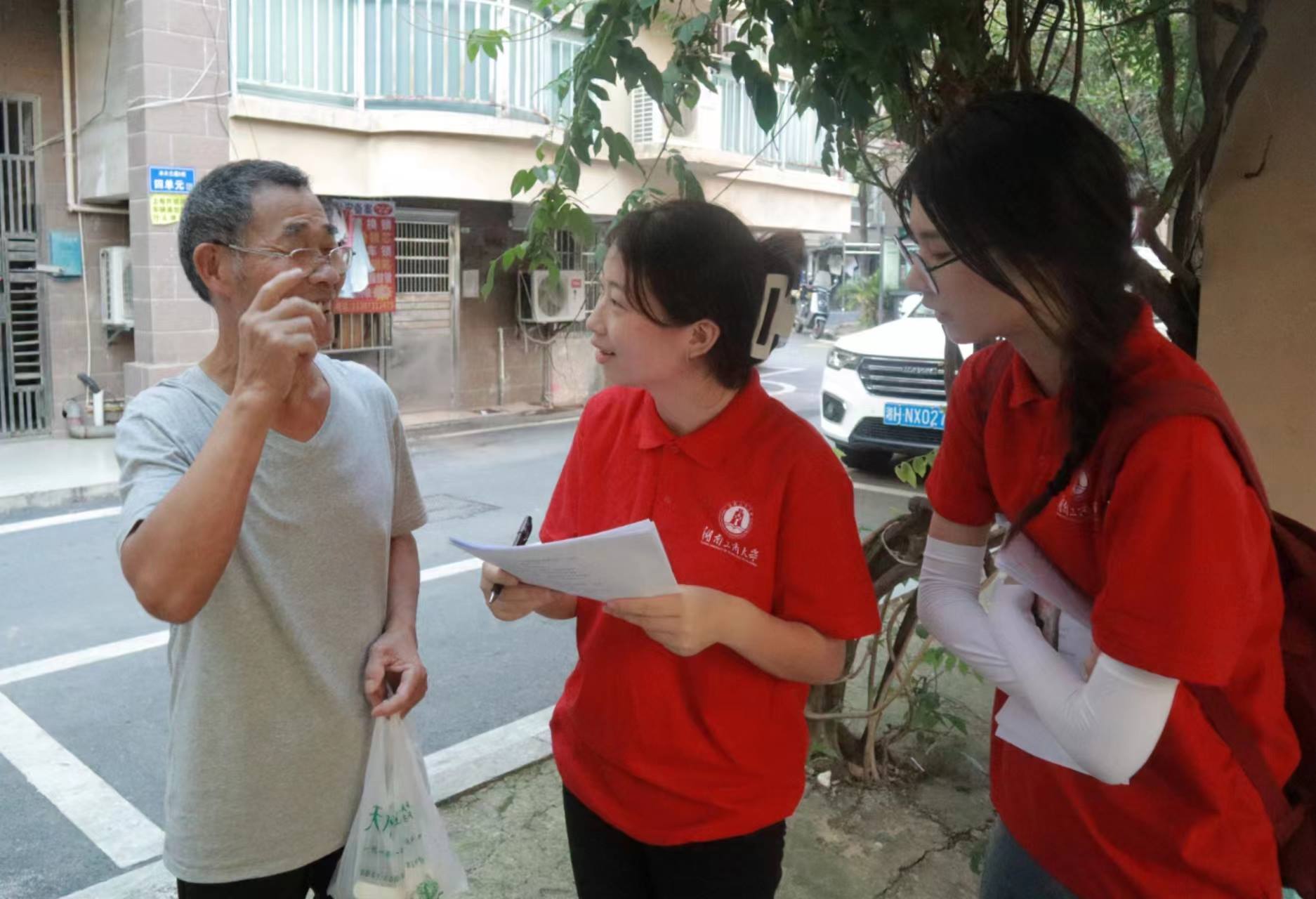圖為黨建逐夢(mèng)小分隊(duì)成員與乘涼老奶奶圍坐并填寫問(wèn)卷(查曉菲 攝)