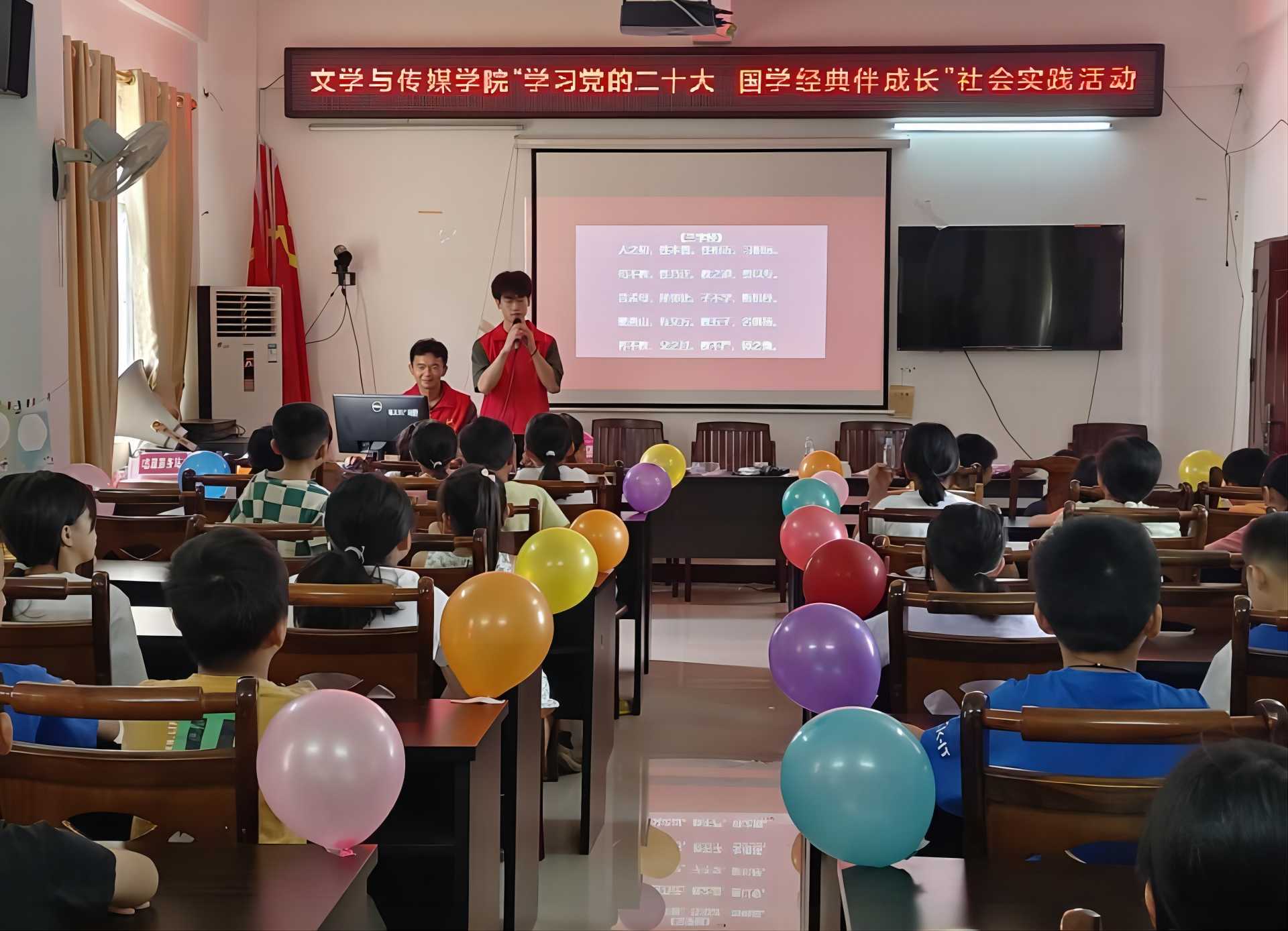 為深入學習貫徹黨的二十大精神,深入學習貫徹習近平總書記關于中華文化的系列重要講話精神,弘揚中華優秀傳統文化,7月9日-18日玉林師范學院文學與傳媒學院組織國學支教實踐團前往玉林市茂林鎮鹿峰社區,開展“學習黨的二十大,國學經典伴成長”暑期“三下鄉”社會實踐活動。