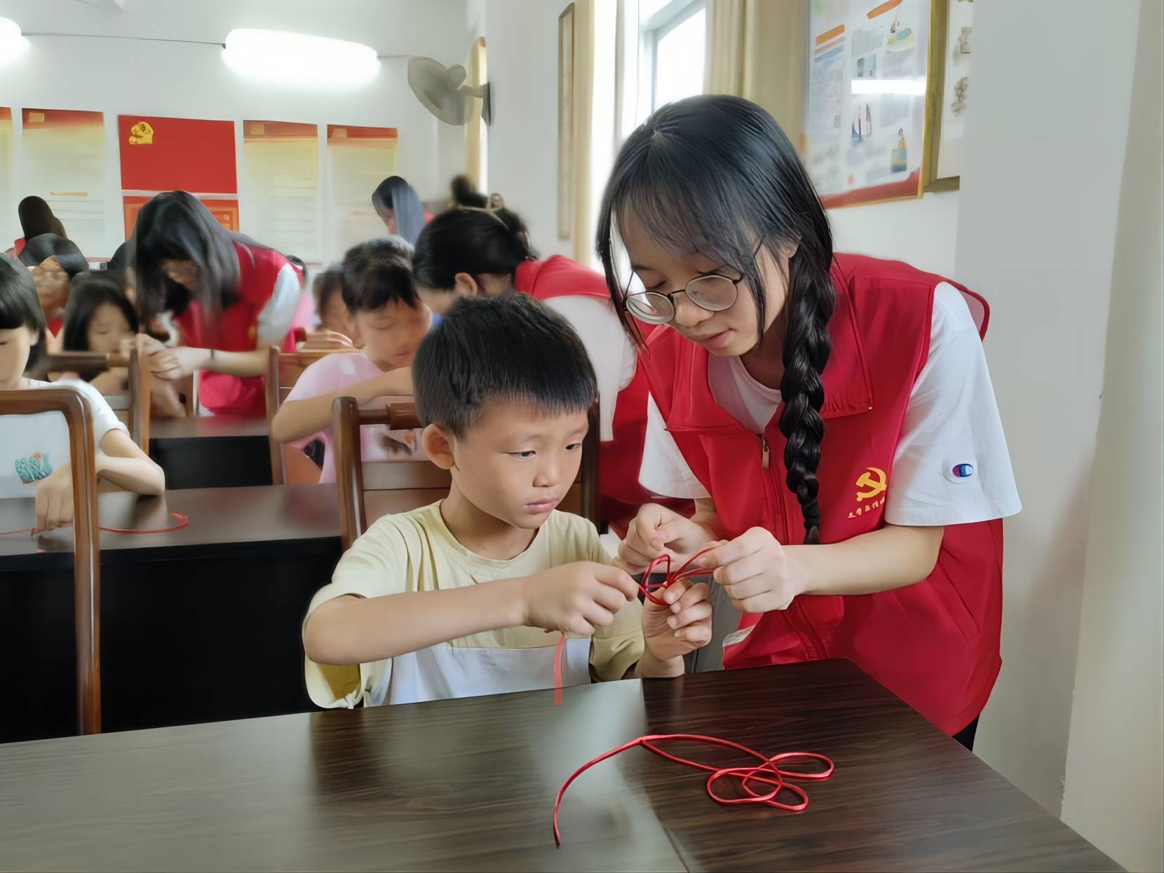 圖為手工課上實踐團成員教小朋友們編中國結。多彩大學生網通訊員謝涵 供圖