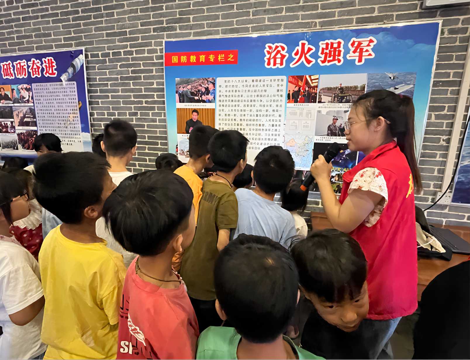 圖為實踐團成員給小朋友們作愛國主義宣講,講解宣傳板報。多彩大學生網通訊員謝涵 供圖