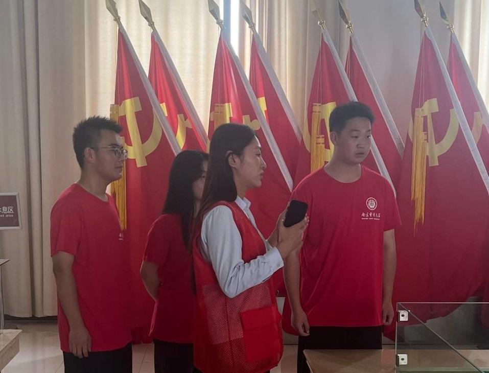 通過采訪紀念館解說員得知,每一座雕像,每一塊石碑背后都有各自的故事。在參觀陵園碑亭內的“八十二烈士碑”時,解說員特別指出,這一塊石碑還保留著當年的歷史原貌,還是氓公當年所書寫的原碑碑文,其內容未作改動或重刻。這是一種對歷史的尊重,一種情懷,亦是對這一段歷史的完整呈現和最好詮釋。除了對園區陳設的介紹,解說員講解了劉老莊八十二烈士陵園背后的戰爭歷史。對于這一段戰爭,講解員感嘆道:“這是一場慘烈得難以用語言敘說的戰斗。是新四軍三師七旅十九團四連將士在抗戰期間于蘇北地區奏響的最悲壯的英雄主義的樂章。”聆聽完解說員的介紹后,團隊成員在演播廳觀看了相關的歷史紀錄片,被抗爭中蘊含的堅定意志所感染。正是前人的血與汗水,才鑄就了現在偉大的中國,我輩青年更應不負韶華,為人民、為國家的建設做出貢獻。