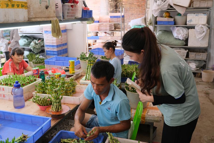 在工作人員的介紹下,團隊成員們了解到富貴竹的葉片翠綠,莖稈筆直,圓形似竹。葉卵形先端尖,葉柄基部抱莖。它是極耐陰植物,在弱光照的條件下,仍然生長良好,挺拔強壯。可以長期擺放在室內觀葉,同時也不需要特別養護,只要有足夠的水分,就能旺盛生長。期間,工作人員還對目前富貴竹的市場和產業難題進行了分析,富貴竹的病死率高和品種單一是困擾富貴竹銷售的兩座大山。