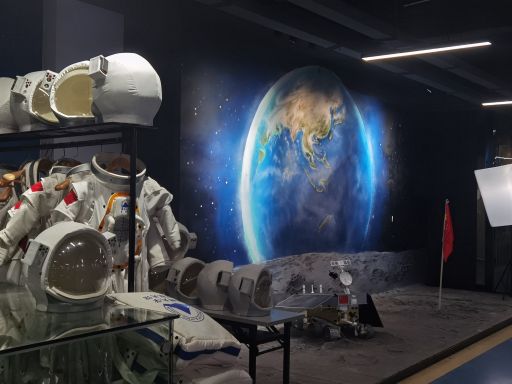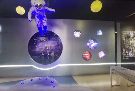 團隊成員陳品汝首先前往二樓進行進一步調研。二樓航天館設有SPACE航天館星際穿越、銀河漫游、登陸月球、太空探險、華夏問天和“未來科學家”空間站6大主題區域,設有中國衛星、空間站、運載火箭等航天實物或模型,并設有體驗區域,開設神舟飛船、宇宙飛船、模擬飛行等模擬活動。該層由八大行星開始介紹,并逐漸過渡到中國的火箭技術的發展、兩彈一星的元勛等。場館內游客眾多,多為家長帶領孩子參觀學習,體驗區的各項體驗游玩設施更是吸引了眾多的孩子們前往體驗。二樓還設有航天科普拓展課程專屬教室,在這里有專門的老師為孩子們傳授航天科普知識。