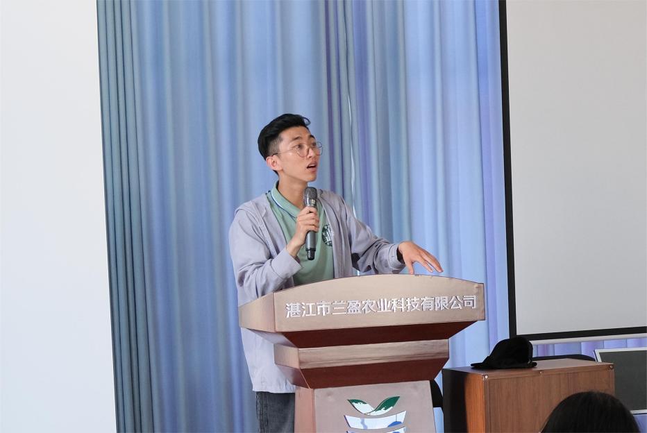 會議上、湛江科技學院經濟與金融學院“百千萬工程”南竹富貴社會實踐團隊長劉錦豪就團隊前期的研究心得與種植戶進行分享。