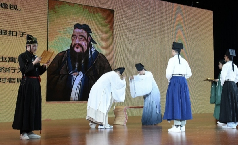 此后,中外青年們前往曲阜師范大學(xué)西區(qū)音樂廳觀看表演。在音樂廳,參與活動的青年們欣賞了一場精彩的舞劇——《杏壇弦歌》。該舞劇以孔子對教育的追求為主題,通過精美的編舞和動人的音樂,生動地展現(xiàn)了孔子崇尚教育的理念和他對于培養(yǎng)人才的獨特見解。觀眾們被舞者們優(yōu)雅的身姿和精湛的舞技所折服,感受到了孔子智慧與教育的力量。活動的高潮是由一位志愿者用七種不同的樂器表演《魚水情》。他巧妙地運用蕭、竹笛、巴烏、塤和葫蘆絲等樂器,演奏出悠揚動人的音樂。外國青年們屏息聆聽,他們被這位志愿者的才華所折服,同時也深深感受到了中國民樂的獨特韻味。在茶藝表演中,一位志愿者展示了中國傳統(tǒng)的茶道文化。她手持精致的茶具,一遍泡茶,一邊講解茶的種類、泡茶的技巧和茶文化的內(nèi)涵。外國青年們聚精會神地觀看著,他們感受到了中國茶文化的博大精深。作為中國古代尊師重教的傳統(tǒng)儀式,拜師禮也成為活動中的一部分。志愿者們以傳統(tǒng)的儀式和動作,向外國友人展示了拜師的過程。他們講解了拜師禮的意義和價值,讓外國青年們親身體驗到了中國古代教育中尊師重教的重要性。