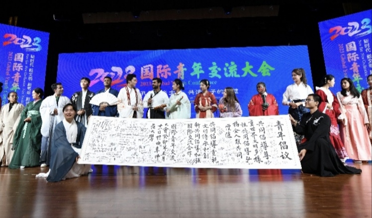 在最后中華漢服走秀中,參與活動的志愿者們身著華麗的漢服,以莊重而優(yōu)雅的姿態(tài)走上舞臺。他們展示了不同款式的漢服,通過細致的講解,介紹了漢服的歷史、設(shè)計和文化內(nèi)涵。外國青年們著迷地欣賞著志愿者們的漢服表演,感受到了漢服的獨特魅力,進一步了解了中國傳統(tǒng)服飾的豐富多彩。交流活動的最后,中外青年共同穿上漢服,并在倡議書上鄭重簽名,一致響應(yīng)中國國家主席習(xí)近平發(fā)出的全球文明倡議。