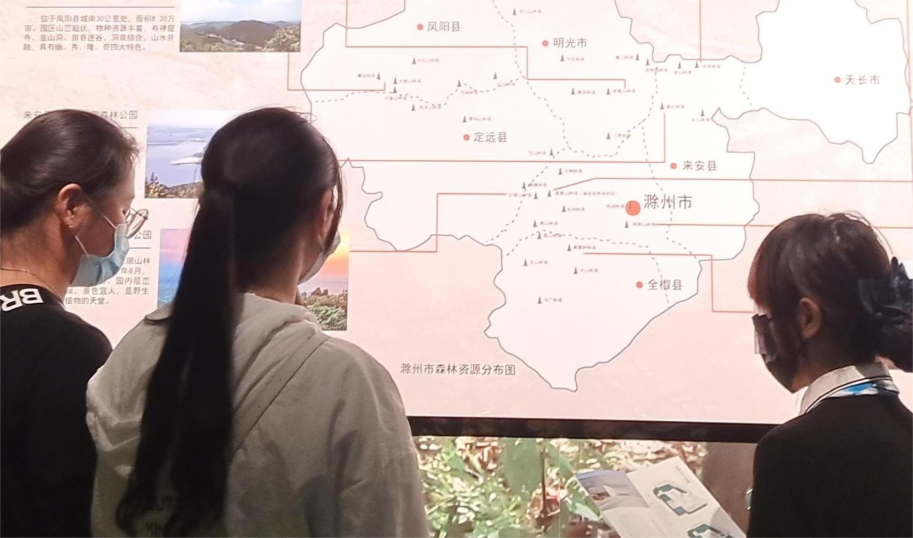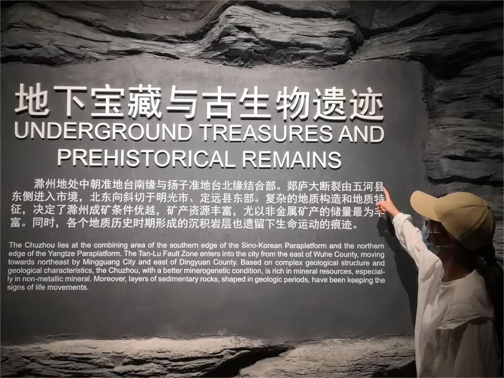 圖為館內(nèi)隊員參觀地下寶藏與古生物遺跡板塊 何成龍攝 滁州市的自然風光秀麗,自然資源豐富。實踐分隊借助 自身地理科學專業(yè)的學科性質(zhì),先后對一層滁州自然風物陳列和二層滁州歷史文化陳列進行了考察參觀。無論是巖溶地貌、古老火山、丹霞地貌、濕地、草場牧區(qū),還是地下寶藏和古生物遺跡,團隊成員都能夠利用所學的地理學學科專業(yè)知識進行全面深入的認識,真正的做到了將所學書本知識與實際相結(jié)合。
