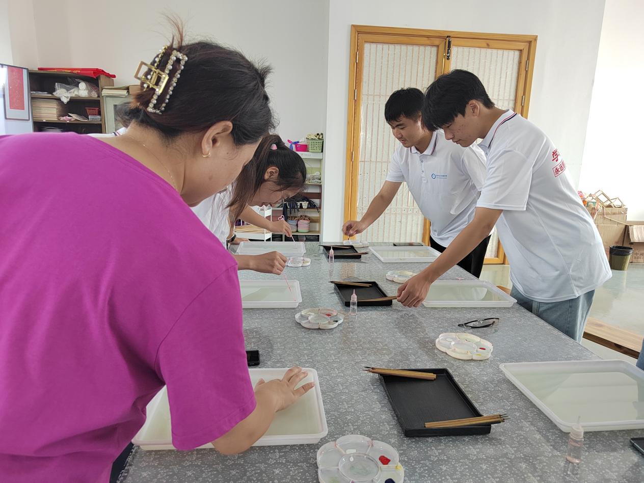 為了更好的了解并傳承紙箋加工技藝,我們同國家級“紙箋加工技藝”代表性傳承人劉靖聯系來到了“掇英軒”參觀,“掇英軒”里設置了展覽和體驗區域,展覽區展示了一系列精美的紙箋作品和相關文化藝術品。我們可以欣賞到各種不同風格和題材的紙箋作品,感受到紙箋藝術的獨特魅力。體驗區則在非遺傳承人的指導下親自體驗制作流沙箋與合歡扇。首先,我們學習了制作流沙箋的方法,老師向我們介紹說,流沙箋是一種古老的傳統文化藝術品,它的制作過程需要細心和耐心。老師準備一種特制的膠狀液體,讓我們將顏料溶解在水中,再輕輕地將顏料點在液體表面,顏料自由擴散,形成獨一無二的花紋。