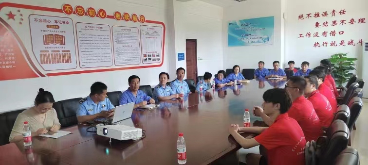 之后劉隊長、楊廠長與實踐團成員們舉行了會議討論,劉隊長主要向同學們介紹了排污口的普查重點,以及利用創新手段摸清底數。