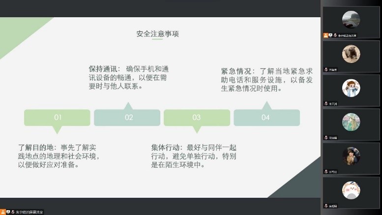 此外,在本次會議中,團隊成員總結出系列安全注意事項。首先需要事先了解目的地,查閱資料提前掌握實踐地點的地理及社會環境,以便做好應對準備。第二,保持通訊,確保手機和通訊設備的暢通,以便在需要時與他人聯系。第三,線下實踐必須集體行動,保證結伴行動,避免單獨行動,特別是在陌生環境中。最后,出發前要先了解當地緊急求助電話和服務設施,以備發生緊急情況時使用。