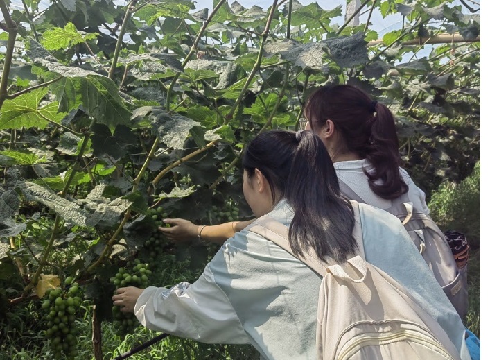 。基地調研,鄉村振興實踐隊員們來到高產經濟作物——陽光玫瑰葡萄基地參觀,據當地農戶介紹,陽光玫瑰具有豐產、穩產,可長時間貯存,栽培簡單,品質優等特點,其肉質較致密,果肉鮮脆多汁,玫瑰香味濃,故名陽光玫瑰。實踐隊員們在基地中跟隨農戶的腳步,與陽光玫瑰葡萄近距離接觸,觀察到葡萄已顯現出成熟的雛形,雖正值六月,但葡萄已然長成了粒大飽滿、顆顆分明的模樣,在陽光的照耀下晶瑩剔透。