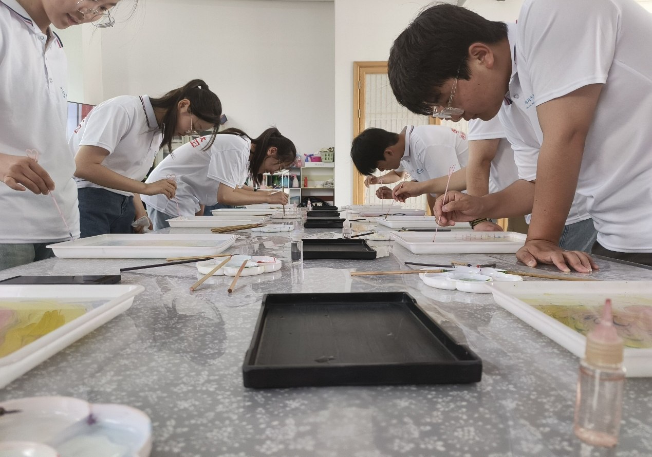 想到這,腳步也隨著張老師的步伐來到了紙箋展區,上方一側是劉靖老師和他的團隊在傳承紙箋技藝、“復活”失傳紙箋名品,創新改良紙箋制作技藝中的一些照片,這些照片無不在訴說著當中苦楚,亦見證了在經過國家及當地政府與掇英軒團隊的共同努力下讓這項非遺技藝煥發新生的喜悅。想到這,我認為非遺保護、傳承是我們青年人應盡的義務,非遺的新生唯有創新可爭取源源不斷的生機,新在其工藝手段、新在其傳播手段、新在其創意整合,破而后立。傳承應當是一個不斷創新的過程。初到掇英軒的下午,我們坐上了制作臺,仔細觀看著劉靖先生給我們拍攝的授課視頻,視頻中他著一身白衣,盡顯素雅之氣,從拿筆姿勢、調色、畫法技巧等諸多方面為我們一一講解。我們仿著劉靖先生的方法,調出了不同的顏色,拿起畫筆浸沾顏料,當筆尖與特制膠液相觸一瞬,顏色向外擴散,竟是第一次我為非遺文化技藝而心動,不由自主的低聲驚嘆。興奮難免會讓我手忙腳亂,當我第一幅作品還未收尾時,其他隊員看見我的作品后便有了“像蒼蠅”“像螳螂”之爭,便草草結束,用宣紙著上這幅“畫”,將這一有趣時刻定格,記憶在那一刻也便按下了暫停,是獨屬于我們和紙箋相遇的記憶。