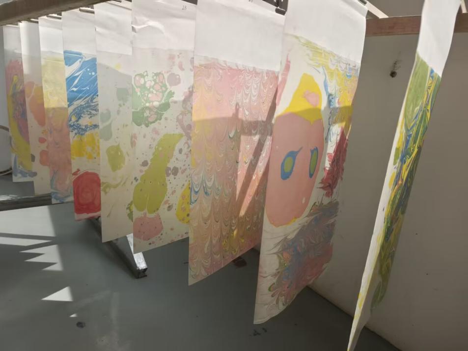 實踐是檢驗真理的唯一標椎,在學習了解了紙箋加工技藝的制作過程后,和傳承人協商,團隊成員向傳承人學習了簡單的鎏金箋制作。在特制的溶液上用顏料作畫,在作畫過程中,我發現呈現的內容和我們預期所想的不一樣,好像無法掌握顏料在溶液上的形狀,顏色的搭配,以及在使用時的順序,會不會使得顏色冗雜等等,這些都是我們所沒有掌握的。這時我們才明白傳承人講的紙箋加工技藝的復雜程度與需要的耐心。如果沒有這次的體驗,我想我也不會明白非遺傳承的難度。在非遺的傳承中,不僅需要傳承人去創新克服困難和政府的扶持,更需要每個人參與到非遺的保護中來,為非遺注入新的活力,使非遺的力量更強勁更持久。