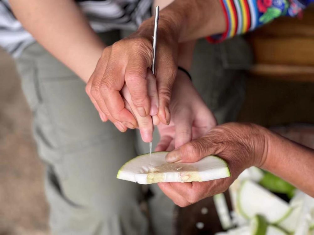 7月18日上午,隊員前往靖州采訪“靖州雕花蜜餞”第五代傳承人羅奶奶。團隊成員觀看其制作過程,品嘗雕花蜜餞。雕花蜜餞,又被稱作“萬花茶”,歷史悠久,具有極高的觀賞價值,是靖州苗侗族人民智慧的結晶。