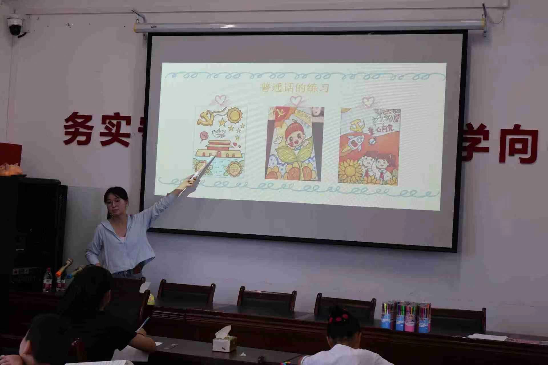 實(shí)踐團(tuán)成員們以藝術(shù)課堂為載體,開展藝術(shù)普通話課堂,帶動(dòng)小朋友辨音識字,小朋友們聽的很認(rèn)真,踴躍的舉手發(fā)言,一個(gè)音節(jié)一個(gè)音節(jié)的朗讀普通話,在自己的畫作上寫下“” 我愛祖國“” “ 普通話宣傳”等字眼,