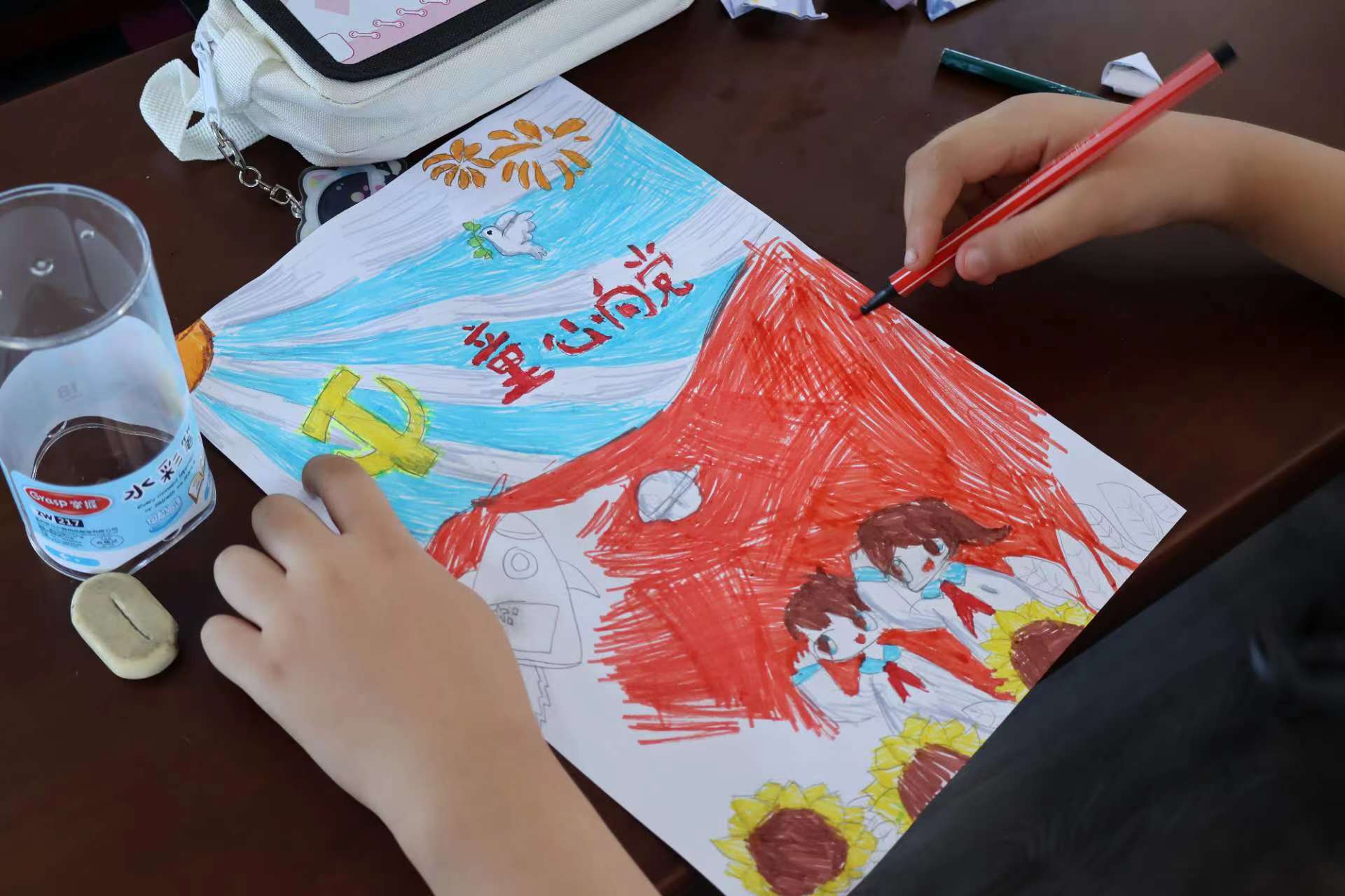 一盒彩筆,一張A4紙,也許就是一個(gè)絢麗的世界。課堂上,小朋友們拿起手中的畫筆,用稚嫩的小手勾勒著心中的小小世界,一筆一畫的寫下漢字與拼音注釋。