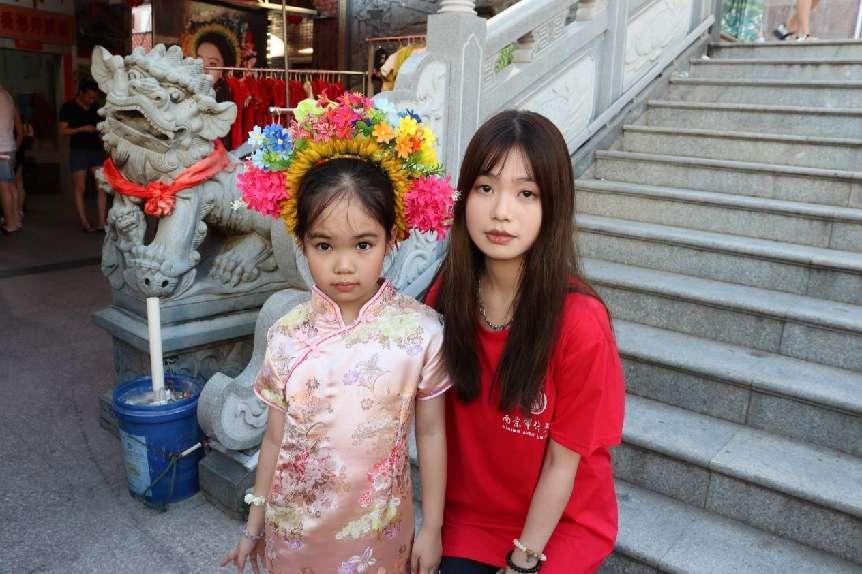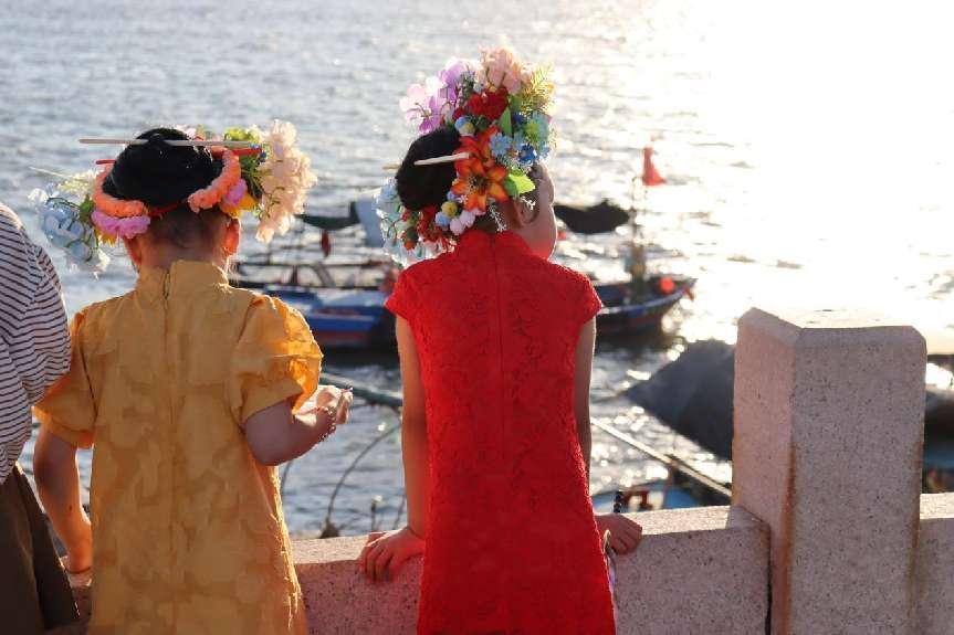 團(tuán)隊(duì)成員走入蟳埔村,遇到一群前來(lái)體驗(yàn)“簪花圍”的小朋友。她們?cè)诋?dāng)?shù)卮迕竦闹笇?dǎo)下盤上頭發(fā),簪上花環(huán),穿上當(dāng)?shù)氐奶赜蟹棥.?dāng)被問(wèn)到體驗(yàn)“簪花圍”的感受時(shí),她們笑著對(duì)團(tuán)隊(duì)成員說(shuō):“戴上花我們也和其他大姐姐一樣漂亮啦!”