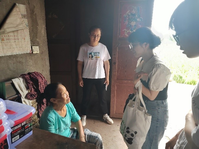 在當?shù)卮逭拇罅ε浜舷拢瑘F隊得以分組開展活動。有的團隊前往矮橋村,有的前往金相村,而另一組則前往雙橋村進行入戶走訪。一路上,蜿蜒曲折的山路讓他們初窺村民求醫(yī)問藥的不便。當志愿者們真正走進這些獨居的爺爺奶奶家中,又感受到了一種莫大的震撼:這些爺爺奶奶的房子多是由早期的土房木房改建,條件艱苦;加之他們上了年紀,身體或多或少有些隱疾;平日又缺乏子女的陪伴,生活難免單調乏味。但志愿者所看到的爺爺奶奶們雖然面臨各種各樣的困難,卻大都保有樂觀向上的生活態(tài)度,他們也許過得很不容易,但他們總能苦中作樂,于不變的日常當中窺見快樂。